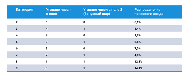 Часть призового фонда, оставшаяся после распределения выигрышей по категориям со второй по десятую, распределяется в первую категорию (суперприз). Угадав 5 чисел в первом поле и бонусный шар во втором, вы получаете суперприз. Суперприз является накапливаемым. Поэтому если в текущем тираже никто не угадает 5 чисел + бонусный шар, накопленная сумма переходит на следующий тираж.