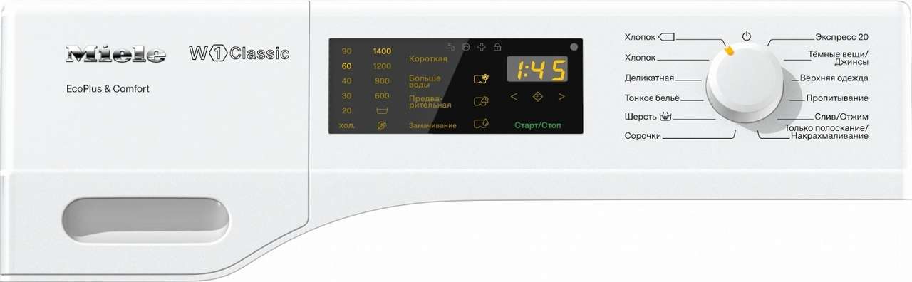 Программы: Хлопок, Хлопок Эко, Деликатная, Сорочки, Экспресс 20, Пропитывание, Шерсть, Верхняя одежда, Тонкое белье, Темные вещи/ Джинсы, только полоскание/ накрахмаливание, слив/отжим.